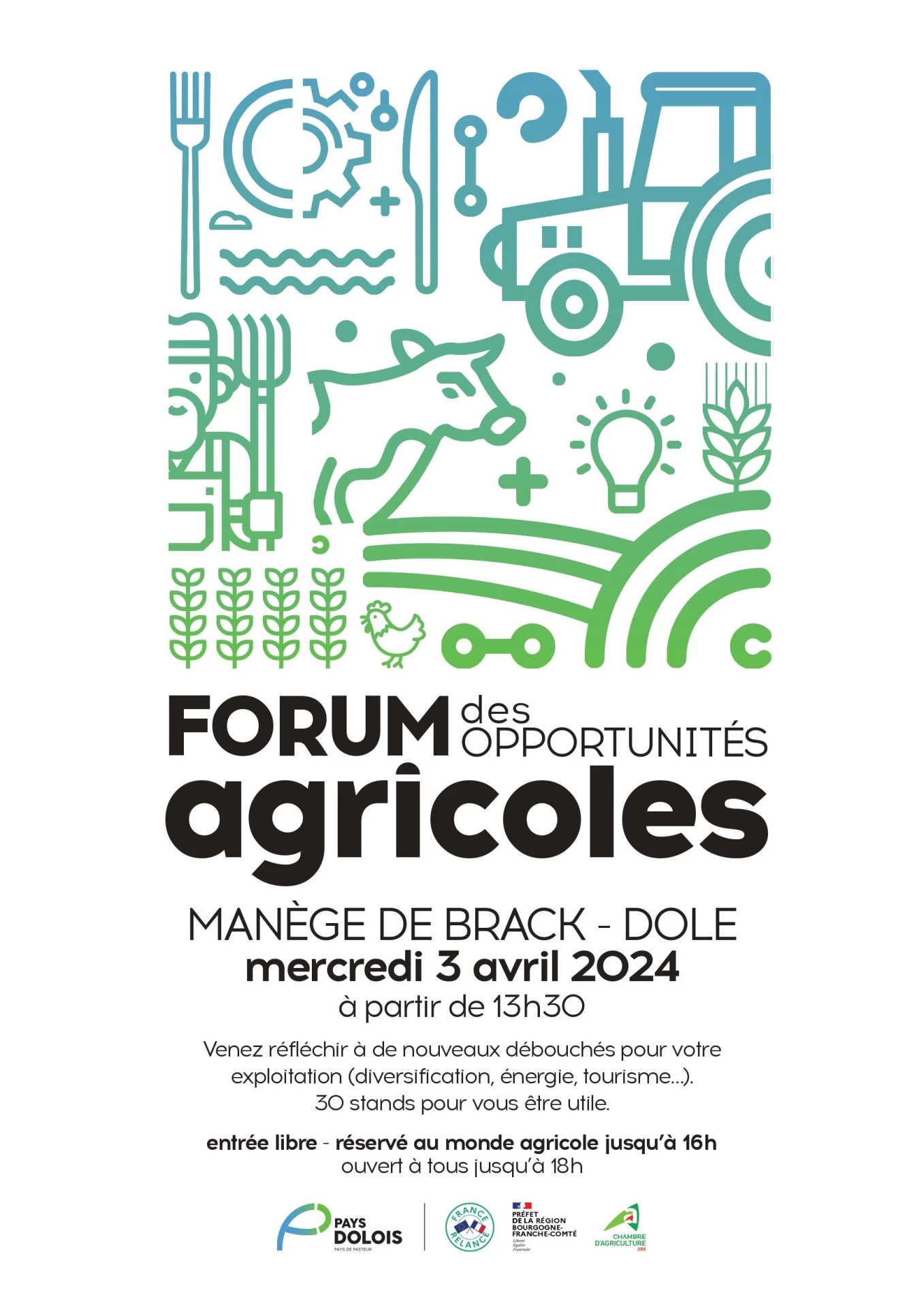 Forum des opportunités agricoles et de la transition alimentaire : mercredi 3 avril de 13h30 à 18h au Manège de Brack à Dole. Diversification, services, énergie, tourisme, start-up… Entrée libre. Réservé au monde agricole jusqu’à 16h.