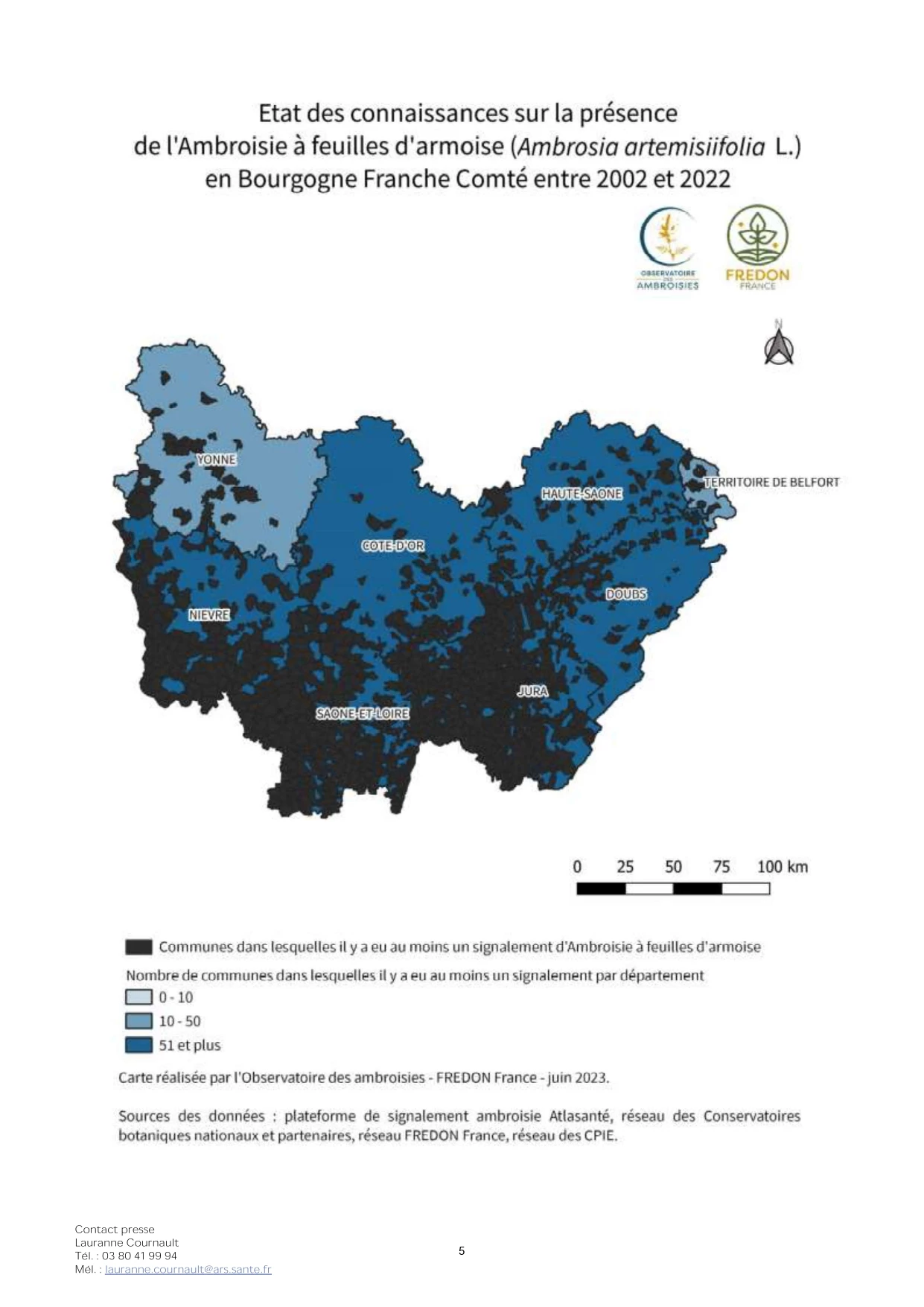 Le bilan de la surveillance ambroisie en 2022 montre que le niveau d’alerte dure 5 semaines dans la Nièvre, département le plus impacté. La Saône-et-Loire connaît également une exposition aux pollens au niveau d’alerte pendant 3 semaines, et le Jura durant 1 semaine. Les autres départements sont impactés dans une moindre mesure. En BFC, 6 à 12% des personnes sont allergiques au pollen d’ambroisie.