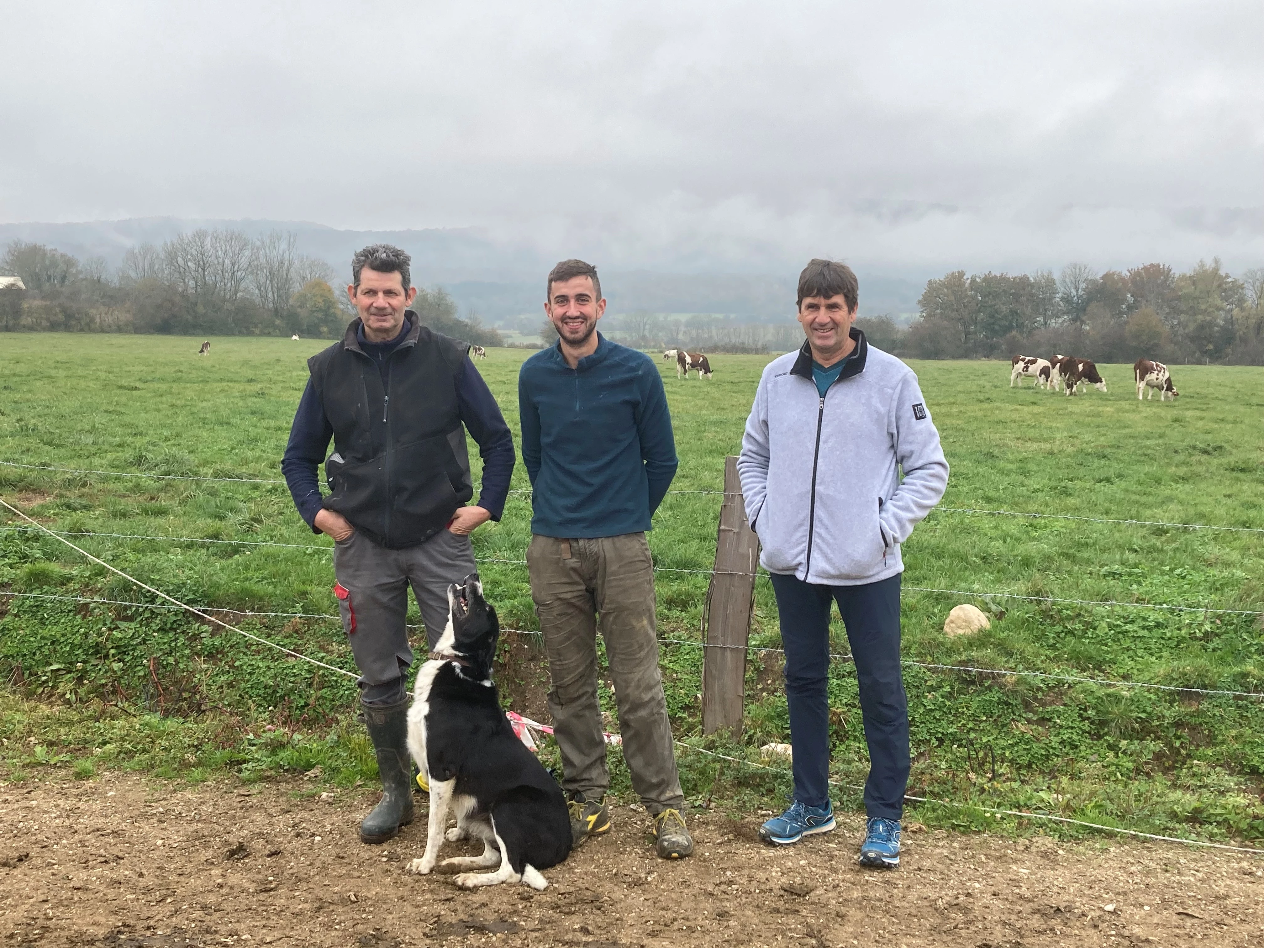 Lorsque la famille Hervé vous parle de leur ferme établie à Pont-de-Poitte et Largillay, vous ressentez tout de suite une énergie positive qui fait du bien. Modestes, ils ne prétendent pas travailler mieux que leurs collègues mais expliquent avec passion et détermination leurs choix. Comme beaucoup d’agriculteurs jurassiens, les trois associés à la tête d’un troupeau de 85 laitières et d’un parcellaire de 225 hectares multiplient les projets pour atteindre l’autonomie alimentaire et énergétique tout en préservant l’environnement. « L’agronomie est la clé de notre système, on ne laisse rien au hasard » affirme en préambule David qui s’est installé il y a deux ans sur la ferme familiale. Lorsque vient le moment d’égrainer la première mesure mise en place sur l’exploitation, le pâturage ressort naturellement de la bouche des associés. Rien de spectaculaire mais avec un système fourrager mixte entre prairies permanentes et temporaires, un suivi rigoureux et quotidien de l’herbe avec un outil de mesure, et un pâturage tournant mais extensif ; tout est pensé pour optimiser la pousse en fonction de la météo. Outre l’intérêt économique, cette gestion de l’herbe permet de valoriser la photosynthèse des plantes permettant ainsi de capter le carbone. Rappelons si cela était encore nécessaire que des prairies en bonne santé sont gage d’autonomie alimentaire et de puits de carbone.