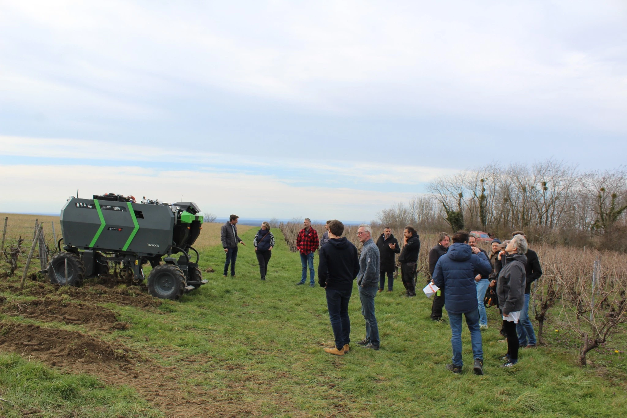 C’est le modèle Traxx de la société Exxact Robotics qui a été choisi pour cette démonstration. L’enjambeur monorang autonome, spécialisé pour la vigne étroite, réalise le travail mécanique du sol à la vitesse de 6 km/h, ce qui lui permet en moyenne de traiter un hectare en 1h30. Doté d’un moteur thermique diesel, son autonomie est comprise entre 18 et 20h. Il peut être équipé de différents outils viticoles : lames interceps, rogneuse, pulvérisateur… « Il est plus léger qu’un enjambeur classique, ce qui limite le tassement des sols et peut travailler sur des pentes jusqu’à 38%, » explique Juliette Rauch, ingénieure chez Exxact Robotics.