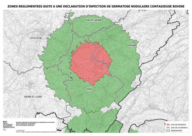 « Dans cette zone, tous les mouvements de bovins sont interdits », ont martelé les services de l’État. Il est néanmoins possible d’obtenir des dérogations exceptionnelles pour raison de bien-être animal (vêlage, blessure grave, manque d’alimentation). Ces laissez-passer sanitaires doivent être demandés et validés par les services vétérinaires de la DDETSPP. En zone de protection (20 km autour du foyer), seuls de petits mouvements intra-exploitation (moins de 5 km) peuvent être tolérés. En zone de surveillance, les restrictions restent fortes mais les dérogations peuvent éventuellement être adaptées selon la situation.